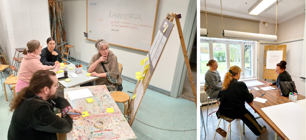 Taiteen perus­o­pe­tuksen opetta­jille järjes­tettiin kaksi työpajaa, joissa pajatyös­ken­telyn tuotoksina koottiin lause­pankki sanal­lisen päättö­ar­vioinnin tueksi, sekä laadittiin tavoit­teiden asettelu ‑kartta ja itsear­vioin­ti­kaa­vakkeet eri ikäryh­mille. Työpajat olivat käytän­nön­lä­heisiä ja osallis­tivat opettajia aktii­vi­sesti. Tämä vahvisti opettajien kokemusta siitä, että arvioinnin kehit­tä­minen on merki­tyk­sel­listä ja heidän omaan työhönsä kuuluvaa.